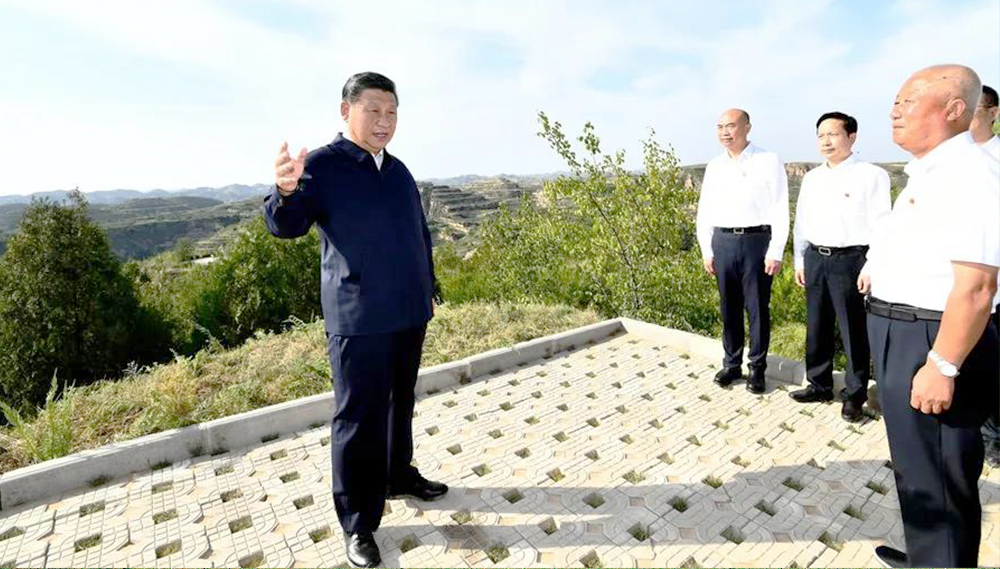 9月13日至14日,中共中央总书记、国家主席、中央军委主席习近平在陕西省榆林市考察。这是13日下午,习近平在米脂县银州街道高西沟村龙头山山顶,考察黄土丘陵沟壑区综合治理情况。(新华社记者 谢环驰 摄)