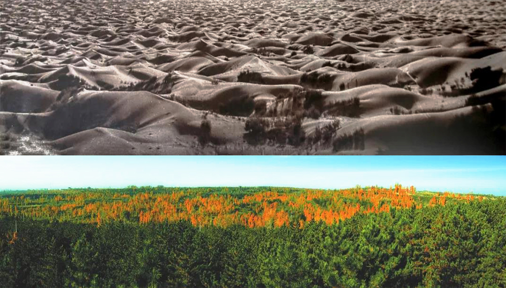 图片陕西省榆林市一处沙地治理前后的不同景象。(来源:陕西省林业局)